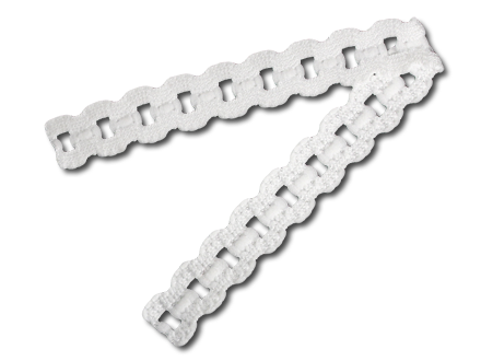 This strap elastic measures 15mm wide (almost 5/8"). It features a chain pattern.